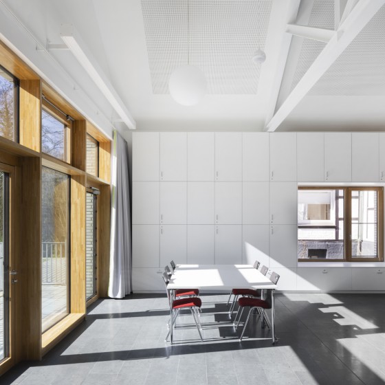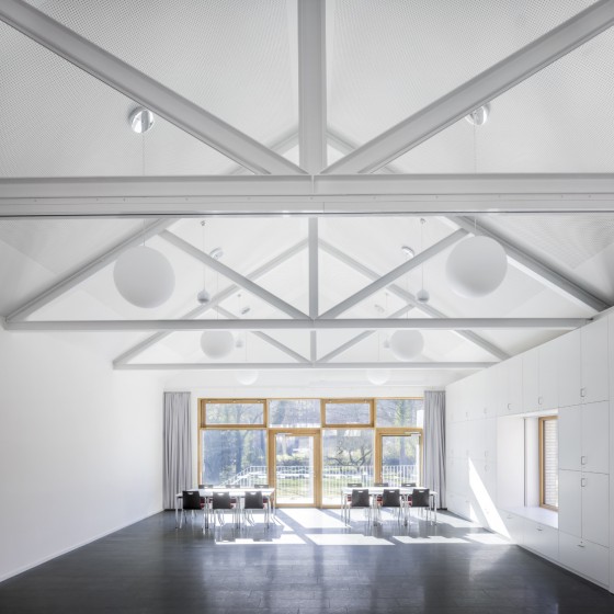 Im Innenraum des neuen Pfarrheims prägen der große Saal sowie das großräumig angelegte Foyer durch ihre Nord-Süd-Ausrichtung das Gebäude und geben die Struktur vor. Großzügig angelegte Glasflächen verleihen diesen Räumen eine Transparenz und es wird eine klare Verbindung zwischen Innen- und Außenraum geschaffen. Eine neue Achse zwischen dem vorgelagerten Platz der Begegnung und dem parkartigen Garten entsteht. Das Gebäude wird zum Ort der Begegnung.