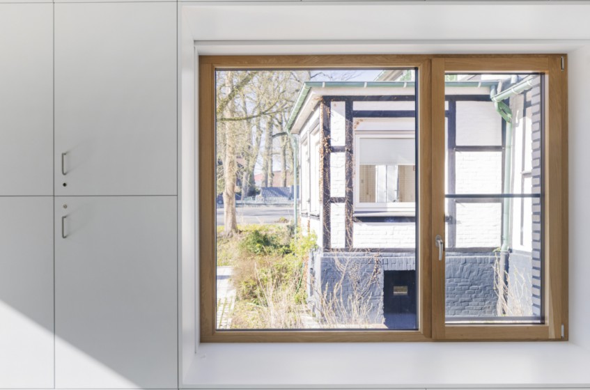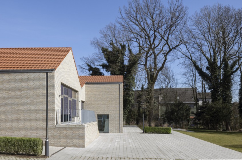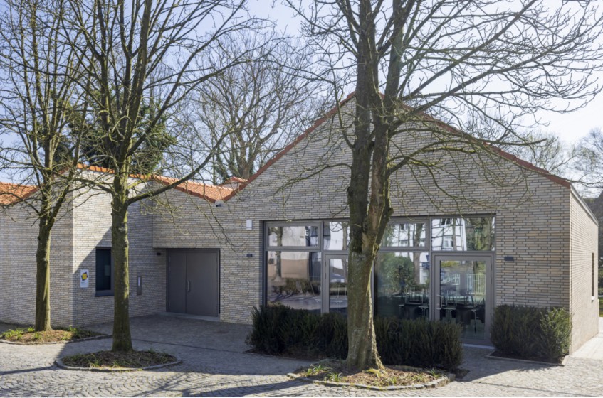 Mit dem freistehenden Neubau des "Hauses der Begegnung" entsteht ein Gebäude, das in seiner Kubatur auf die Beschaffenheit des Geländes reagiert. Während das Gebäude in Richtung des „Platz der Begegnung“ eingeschossig ist, entsteht durch den halbgeschossigen Versatz in Richtung Süden - zum Garten hin - eine Zweigeschossigkeit. Die auf den Grundriss abgestimmte Dachform wie auch die daraus folgende Giebelständigkeit fügen sich angemessen in die sie umgebende, bestehende, kleinteilige Bebauung ein. Die Fassadengestaltung mit sandfarbenem Klinker orientiert sich an der Materialität des naheliegenden Kirchenbaus.