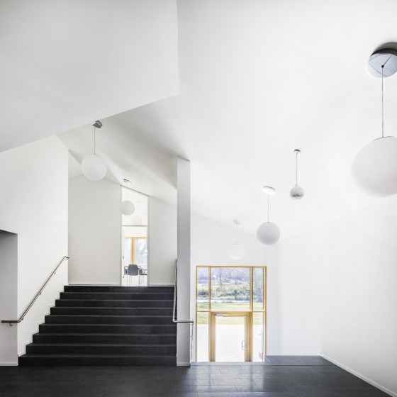 Um das zentral gelegene Foyer ordnen sich alle weiteren Funktionsbereiche des Pfarrheims sinnvoll an. Direkt am Eingang liegen die Büroräume der Verwaltung mit vorgeschalteter Wartezone. Die Küche schließt sich an das Foyer an und ist gleichzeitig von außen anlieferbar. Über die Küche können sowohl das Foyer als auch der große Saal bedient werden. Der Jugendbereich sowie die darüber liegenden Gruppenräume sind nach Süden orientiert und auch über das Foyer zugänglich. Der Jugendbereich hat zusätzlich einen separaten Zugang.