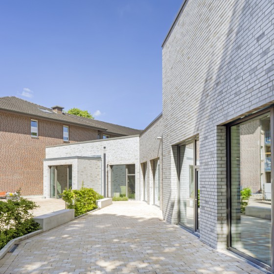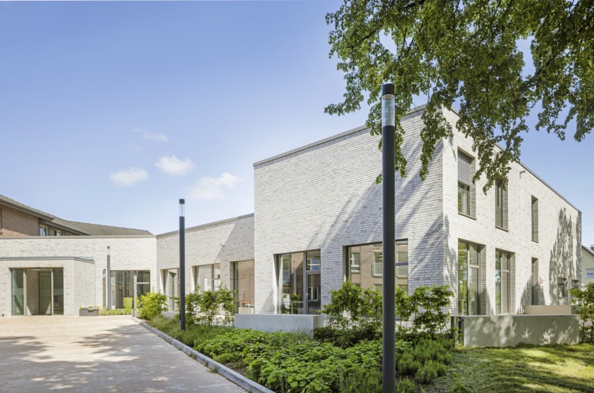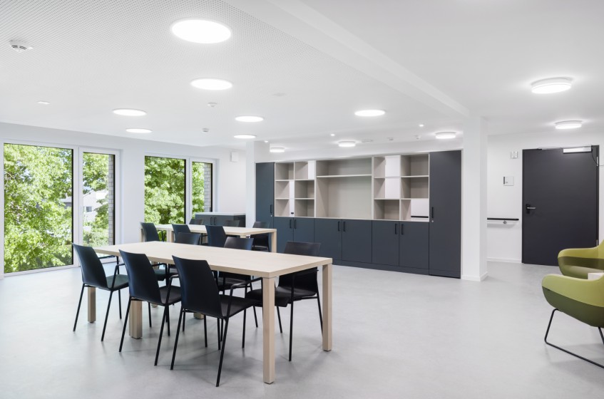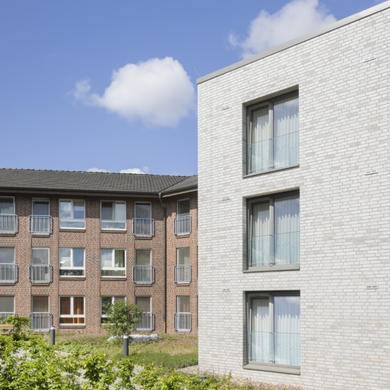 An der Nahtstelle von Abriss und Bestand wurden drei jeweils in Struktur und baulichem Erscheinungsbild gleichförmige Ergänzungsbauten erstellt. Die somit neu entstandenen 123 Zimmer in 9 Wohngruppen für je 13 bzw. 14 Bewohner gruppieren sich nun jeweils um eine eigene neue Mitte zwischen Bestand und Neubau - einem Treffpunkt mit großer Nutzungsvielfalt (zusammenkommen, lesen, spielen, essen, gemeinsam kochen etc.) und hoher Aufenthaltsqualität (großzügige Verglasung zu angegliedertem Balkon). Im Bestand wurden Doppel- zu Einzelzimmern, die erforderlichen Pflegearbeits- und Nebenräume wurden unter geringen baulichen Umstrukturierungen nachgewiesen. Ergänzt wird das anspruchsvolle Raumprogramm von einer neu geschaffenen Caféteria mit Küche, einer Bibliothek und einer Kapelle.