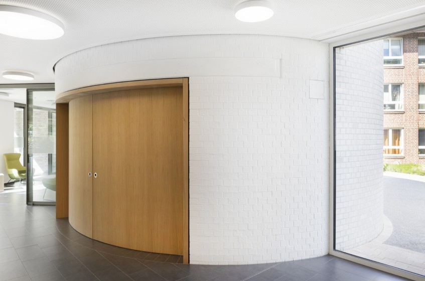 Ziel des Entwurfs ist die Neuordnung des Wohnbereichs in 9 übersichtliche Wohngruppen auf 3 Geschossen unter baulicher Ergänzung des Bestands aus den 90er Jahren. Dafür wurden – ohne wesentliche Belastung für die Wohngruppen – im laufenden Gebäudebtrieb die Köpfe der drei Wohnriegel mit den dort bisher dezentral positionierten Gemeinschaftsräumen bis in die Gründung abgebrochen.