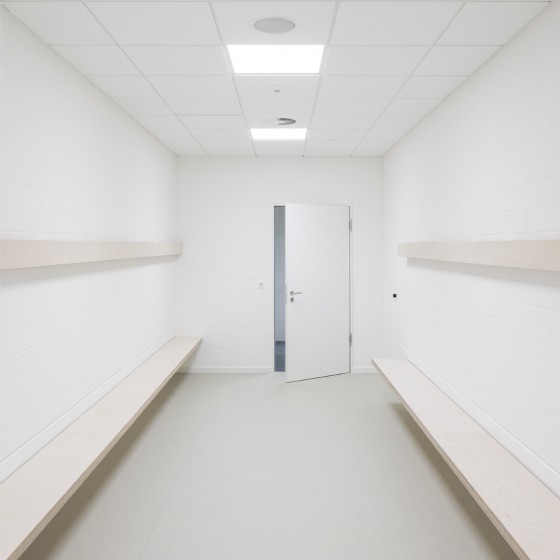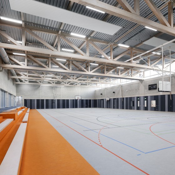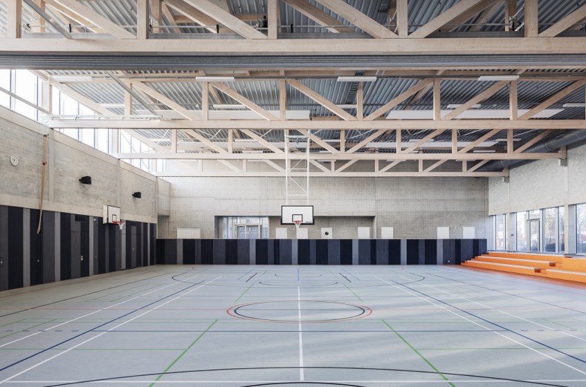 Der Skelettbau schafft eine inspirierende Umgebung für sportliche Aktivitäten. Der Innenraum ist lichtdurchflutet - große Fensterflächen und eine helle Farbgestaltung sorgen für eine freundliche Atmosphäre. Die Konstruktion basiert auf leichten, geweißten Holzfachwerkträgern, die eine nachhaltige Bauweise ermöglichen und gleichzeitig eine offene, großzügige Raumwirkung unterstützen.