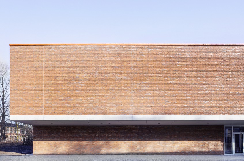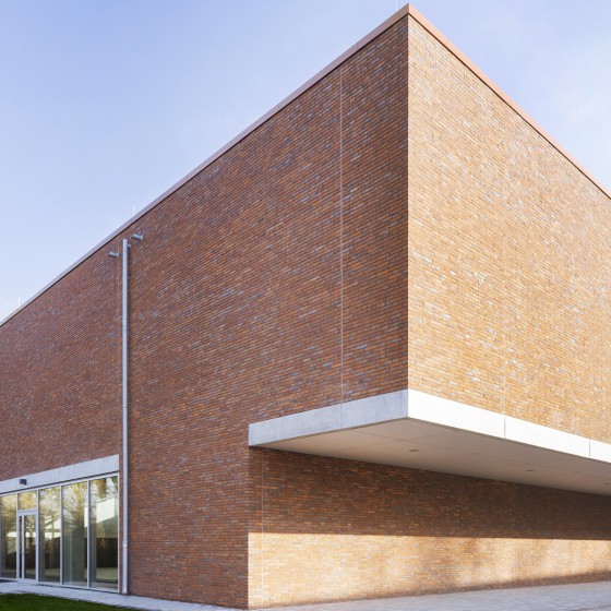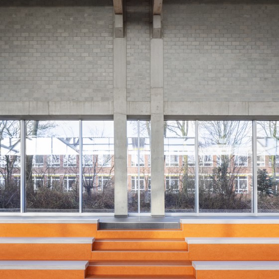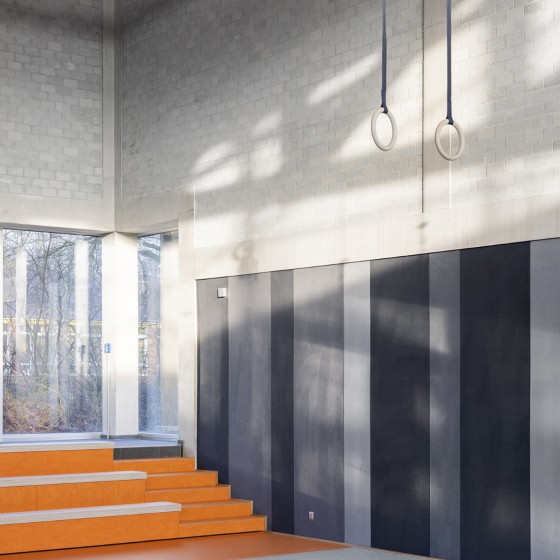 Ein besonderes gestalterisches Element ist die gezielte Farbgebung: Orange Akzente im Innenraum fördern die Bewegungsfreude und steigern die Energie der Sportler. Die äußere Kubatur zeichnet sich durch klare Kanten und eine reduzierte Formsprache aus. Rote Klinkersteine und hellgrauer Beton geben der Halle eine zeitlose und prägnante architektonische Präsenz.